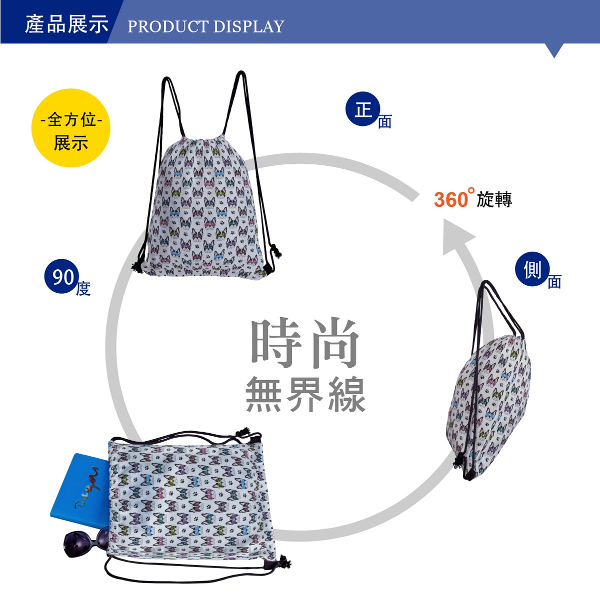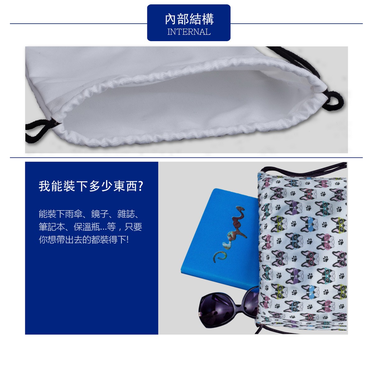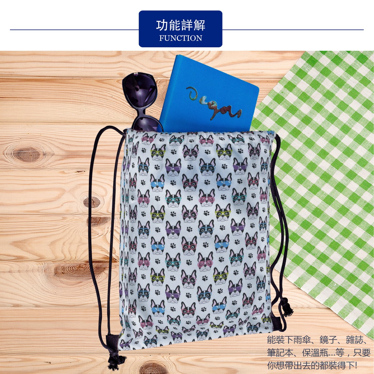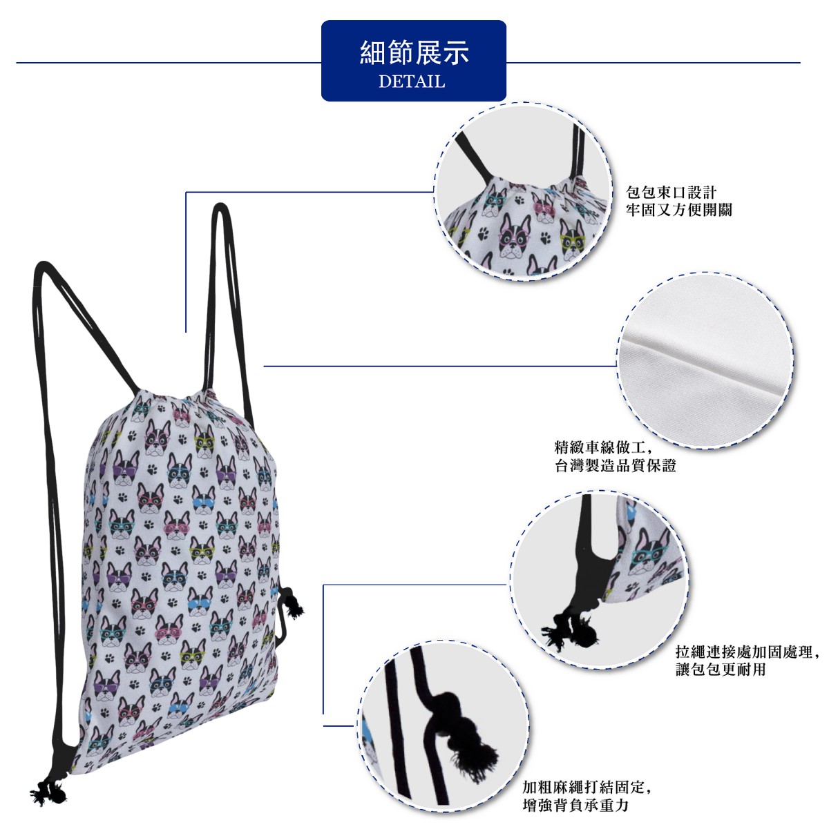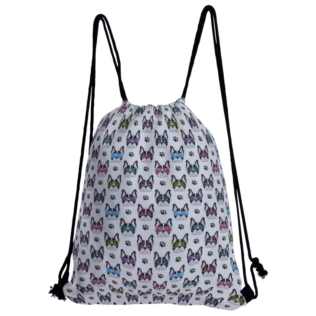 戴眼鏡的法國鬥牛犬帆布束口背包材料包
